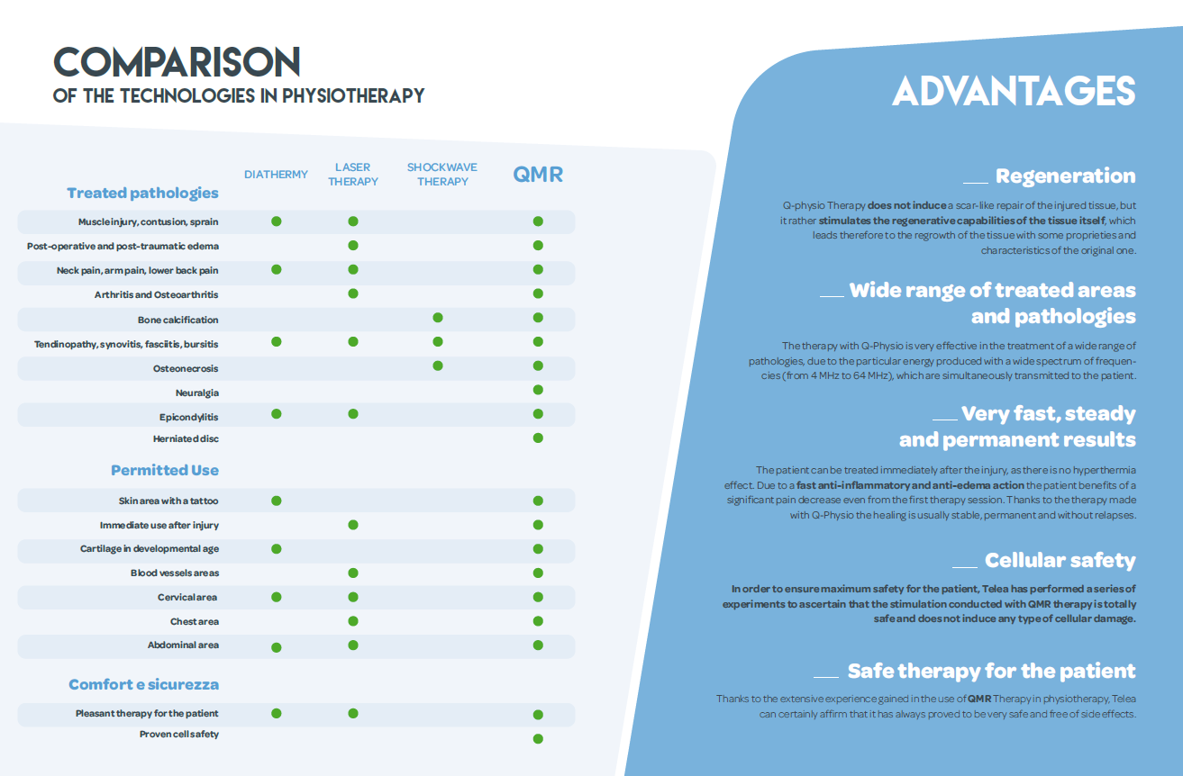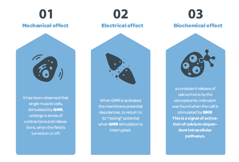The QMR in Physiotherapy is not based on a tissue heating effect but on the regeneration of the biological tissue through the particular cellular stimulation. This interaction with the cells occurs in a completely different way than the traditional hyperthermia. The effectiveness and capability of QMR technology in physiotherapy is supported by Scientific Studies that prove its validity.